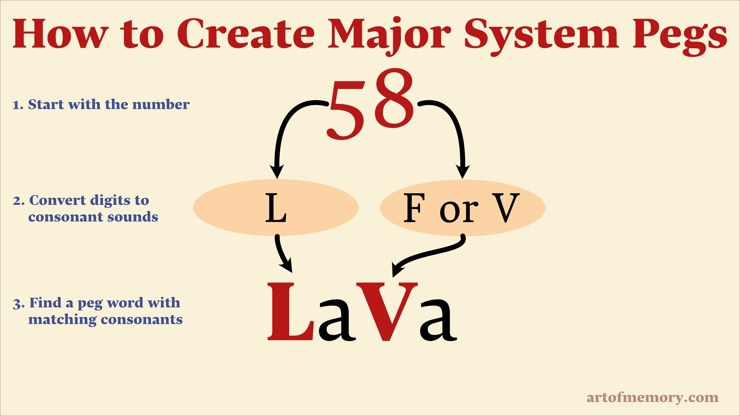 پس می توان با قرار دادن حروف صدا دار a e i o u یک لغت بسازیم ، مثلا عدد 33 با کد گذاری اعداد می شود mm و با قرار دادن حرف o در بین انها به کلمه mom می رسیم که در تمام دنیا معنی مادر می دهد ، پس در ادامه می توان تصویر مادر برای عدد 33 در نظر گرفت .