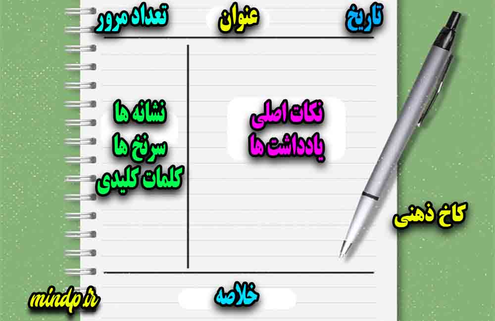 خیلی پیچیدش نکنید سعی کنید بصورت ساده و روشن یادداشت کنید و اگر بلافاصله بعد از مطالعه یا پایان کلاس ، قسمت خلاصه یعنی پایین کاغذ پر کنید این اطمینان دارید که با درک کافی و درست بخش خلاصه پر کردید .